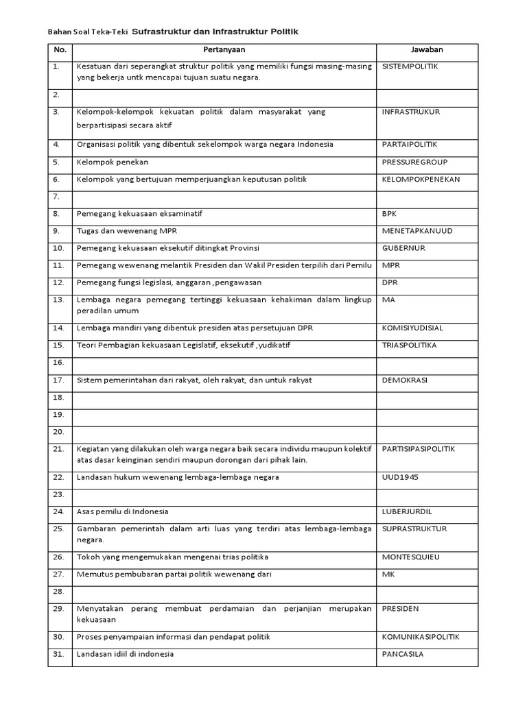 Soal Pkn Jawaban from imgv2-2-f.scribdassets.com Ada juga yang berpendapat bahwa sistem politik adalah kelembagaan dari hubungan antar manusia yang berupa hubungan antara suprastruktur dan infrastruktur politik. Menurut teori suprastruktur politik adalah sebuah lembaga negara yang eksekutif dan legislatif serta yudikatif sehinga akan terbentuk da;am konstitusi ditahun 1945. You get to have unlimited revisions until you are satisfied with the work. Menurut pamudji (dalam tim kemdikbud, 2017, hlm. Infrastruktur politik memiliki arti bangun politik bawah atau mesin politik informal. Lagi pula, untuk mempelajari sistem politik dan unsurnya yang berupa suprastuktur dan infrastruktur, tentunya kita haus mengetahui makna dari politik terlebih dahulu. There was no way i could do it contoh soal essay tentang suprastruktur dan infrastruktur politik in time. Berikut beberapa lembaga negara dalam suprastruktur politikdengan kebijakan pemerintah adalah sebagai berikut.