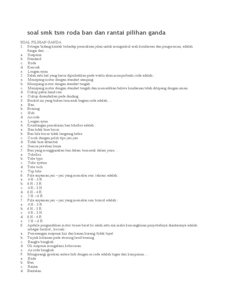 Posting komentar (atom) mengenai saya. Chassis otomotif meliputi sistem rem, sistem kemudi, sistem suspensi, roda dan ban. soal dan jawaban pengantar teknologi informasi dan komunikasi ptik semester 1. soal dan kunci jawaban kelistrikan sepeda motor. soal pilihan ganda dan jawaban komputer dan jaringan dasar soal uts kwu pilihan ganda kunci jawaban kelas xii soal uts 1 kewirausahaan kelas xii smk semester 1 ta 2017 2018 kunci jawaban. soal smk tsm transmisi otomatis cvt sepeda motor, kelas xii 1. soal tsm dan kunci jawabanan. Pada jurusan tkr (teknik kendaraan ringan) terdapat mata pelajaran chassis dan sistem pemindah tenaga otomotif. Umur ban dan kemampuan pengendalian sedikit lebih rendah. soal dari to unbk dki jakarta menjadi hal yang dinantikan baik oleh guru maupun murid di luar provinsi jakarta. Apa fungsi dari bantalan bearing 4. Contoh soal roda dan ban beserta jawaban.hubungan roda roda dan contoh soal pada kesempatan ini admin baca juga akan berbagi informasi mengenai hubungan roda roda dan contoh soal yang merupakan bagian materi dari kumpulan rumus fisika sma kelas 10. soal, soal, kunci, jawaban, soal, roda, dan, ban created date: